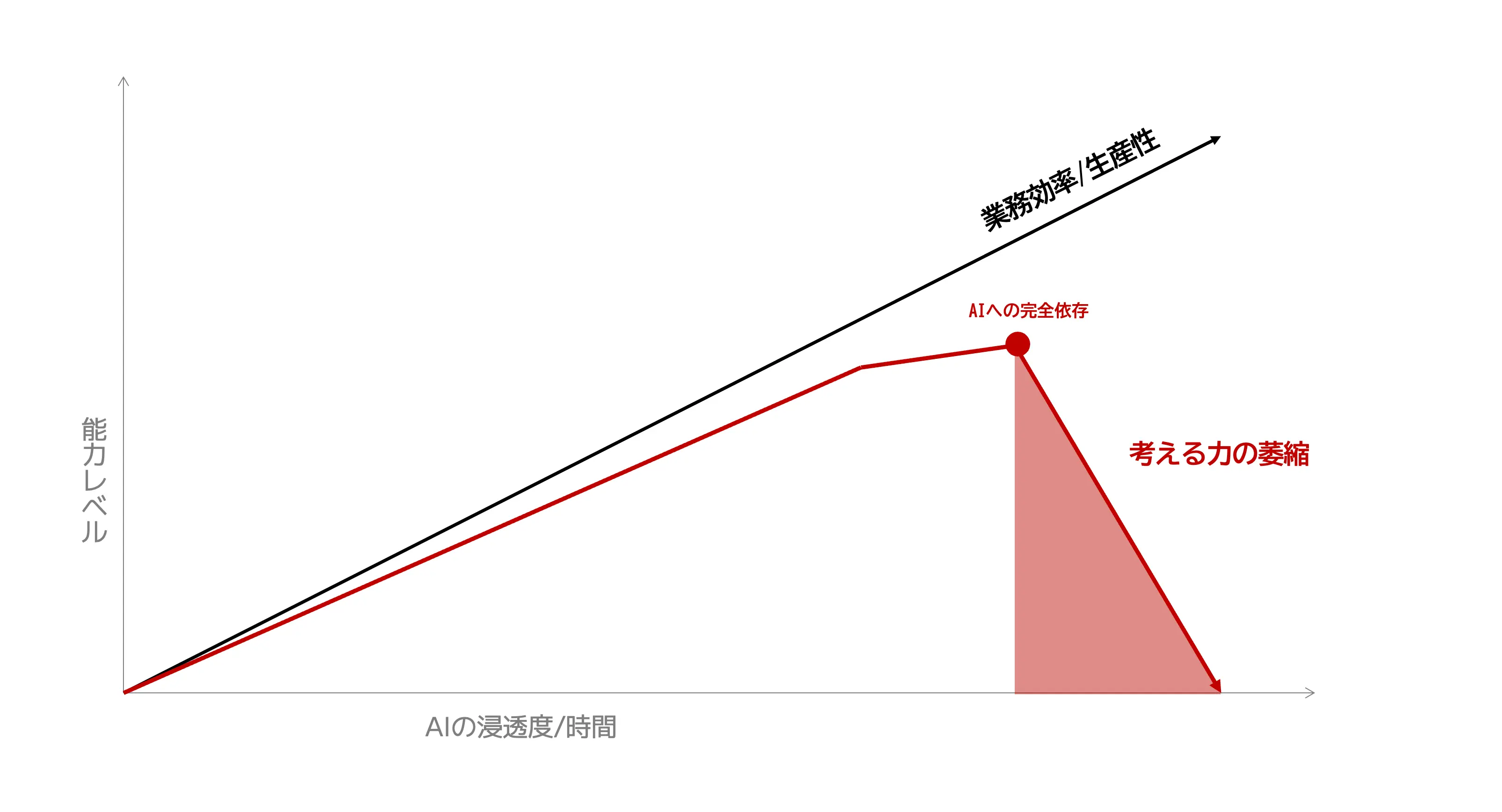AI導入がもたらす最大の恩恵は「生産性の向上」ですが、そこには見えない罠が潜んでいます。効率化が進む一方で、組織の核心的な競争力である「人間の判断力」が構造的に侵食されてしまうのです。従業員がAIの遂行能力を過信するあまり、自らの思考力を停止させてしまう「認知的オフローディング」が起こり始めることが、いくつかの研究において確認されています。