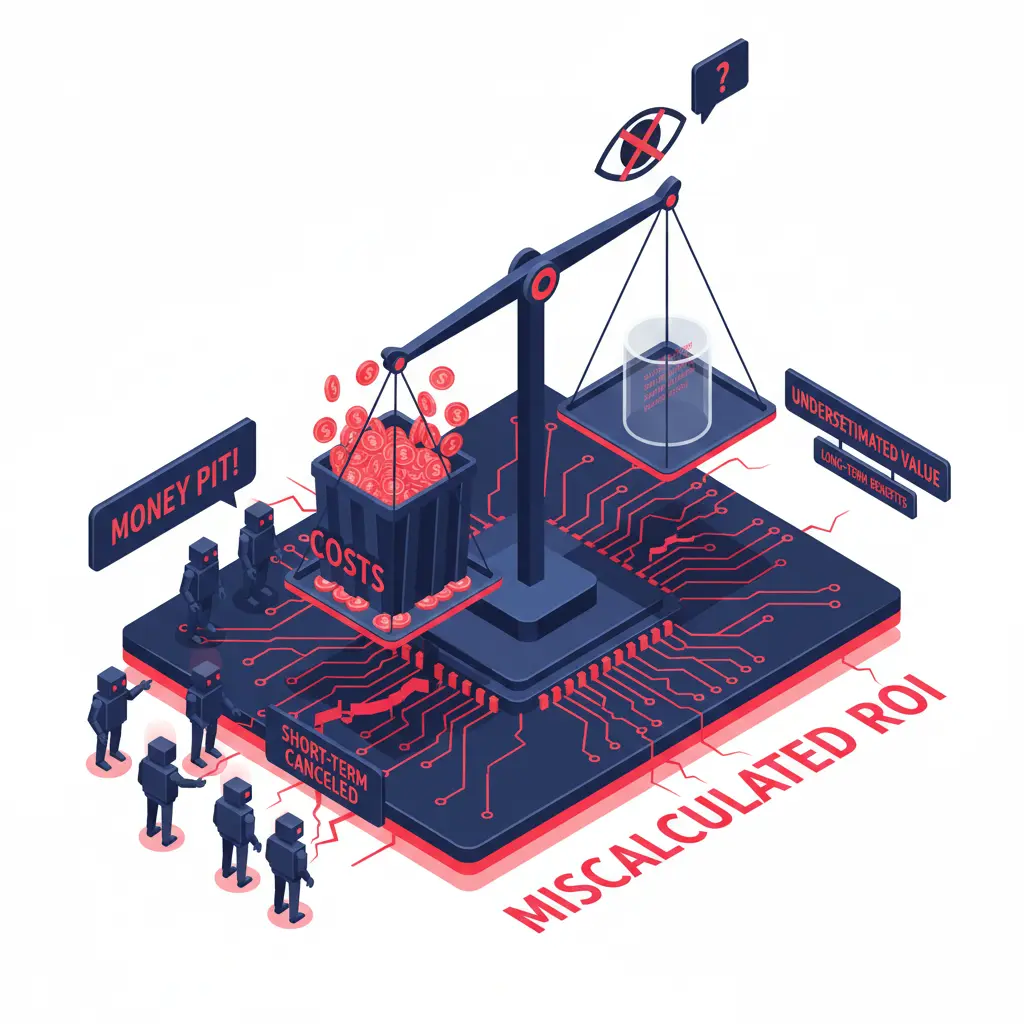 コストばかりに目を向けた経営層が評価を見誤ると、 AIプロジェクトは金食い虫扱いされ、短期的な費用対効果を理由に打ち切られる。