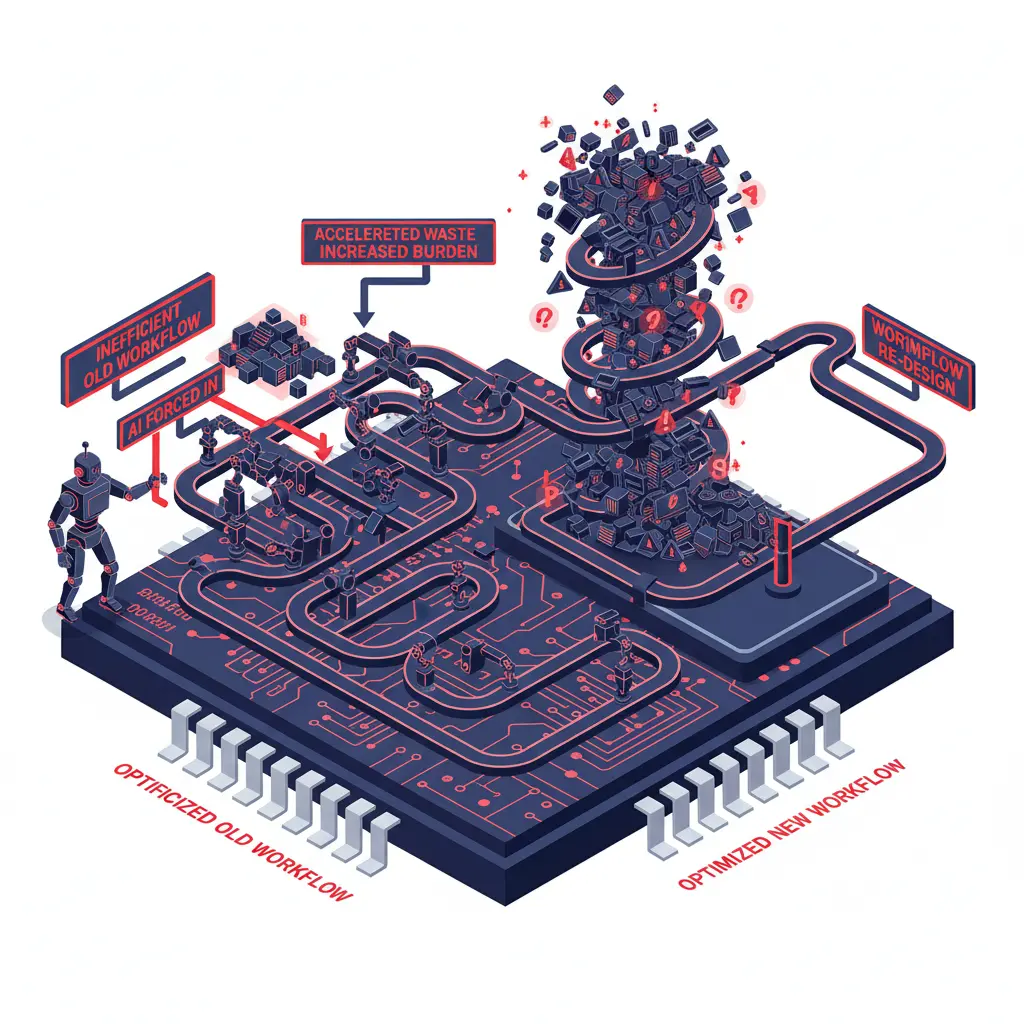 既存の非効率なフローを見直す「業務の断捨離」なくAIを無理やり押し込み、逆に無駄をAIで加速させ、業務負荷を増大させてしまう。